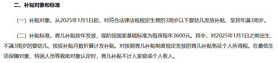 根據(jù)新發(fā)布的《育兒補(bǔ)貼方案》,自2025年1月1日起,每個(gè)孩子(不限孩次)每年可領(lǐng)取3600元補(bǔ)貼,直至年滿3周歲。這標(biāo)志著國(guó)家開(kāi)始向全國(guó)有嬰幼兒的家庭發(fā)放育兒現(xiàn)金補(bǔ)貼,減輕家庭養(yǎng)育負(fù)擔(dān)。那么,不滿3周歲的孩子都能申領(lǐng)嗎?具體如何申領(lǐng)呢?